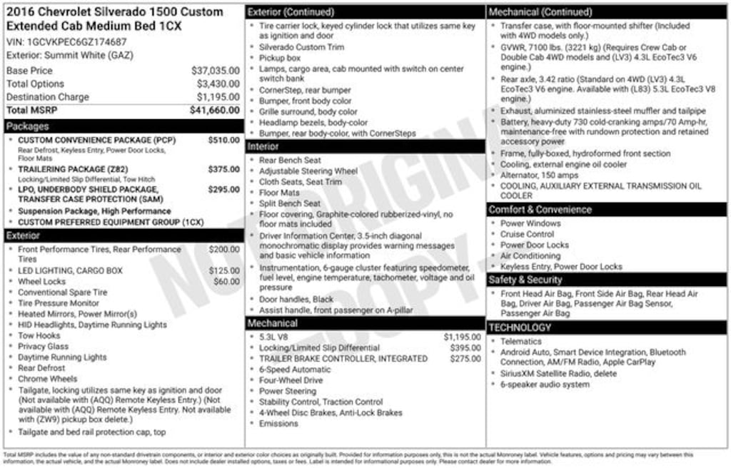 Inside, you'll find a well-appointed cabin with premium cloth seating, a 7-inch touchscreen infotainment system, Bluetooth connectivity, and a premium audio system. The Custom Convenience Package adds thoughtful features like a remote locking tailgate, rear window defogger, and color-keyed carpeting with rubberized floor mats.