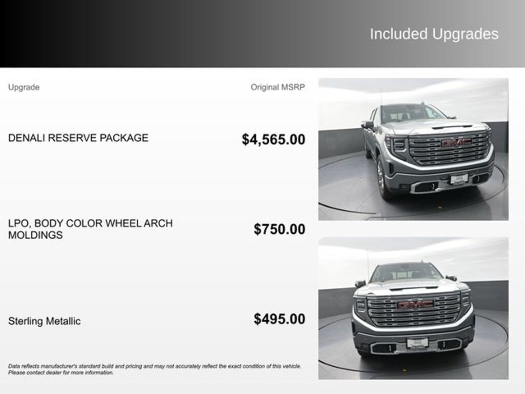 - Sterling Metallic exterior with the Denali Reserve Package, including the Technology Package, sunroof, GMC MultiPro Power Steps, and 22" Painted Aluminum Wheels